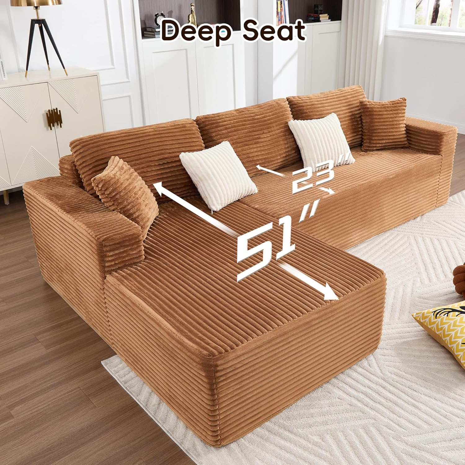 Love this couch! Super comfy with deep seats and the oversized chaise is amazing for lounging. The corduroy fabric is soft but feels durable, and the color is perfect. The best part is it came fully assembled! Looks great, feels great, worth every penny.