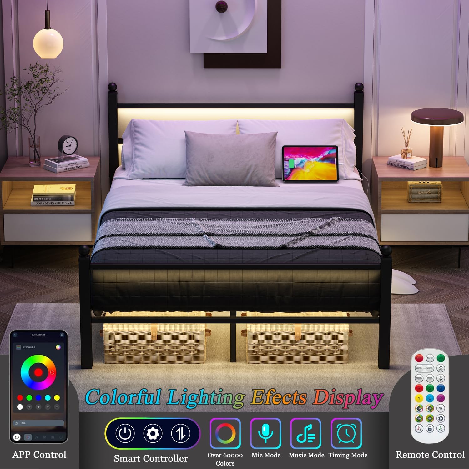 Our metal full bed frame can be controlled via an app control to display over 60,000 colors. Lighting can change brightness, color, and pattern to follow the rhythm of the music.