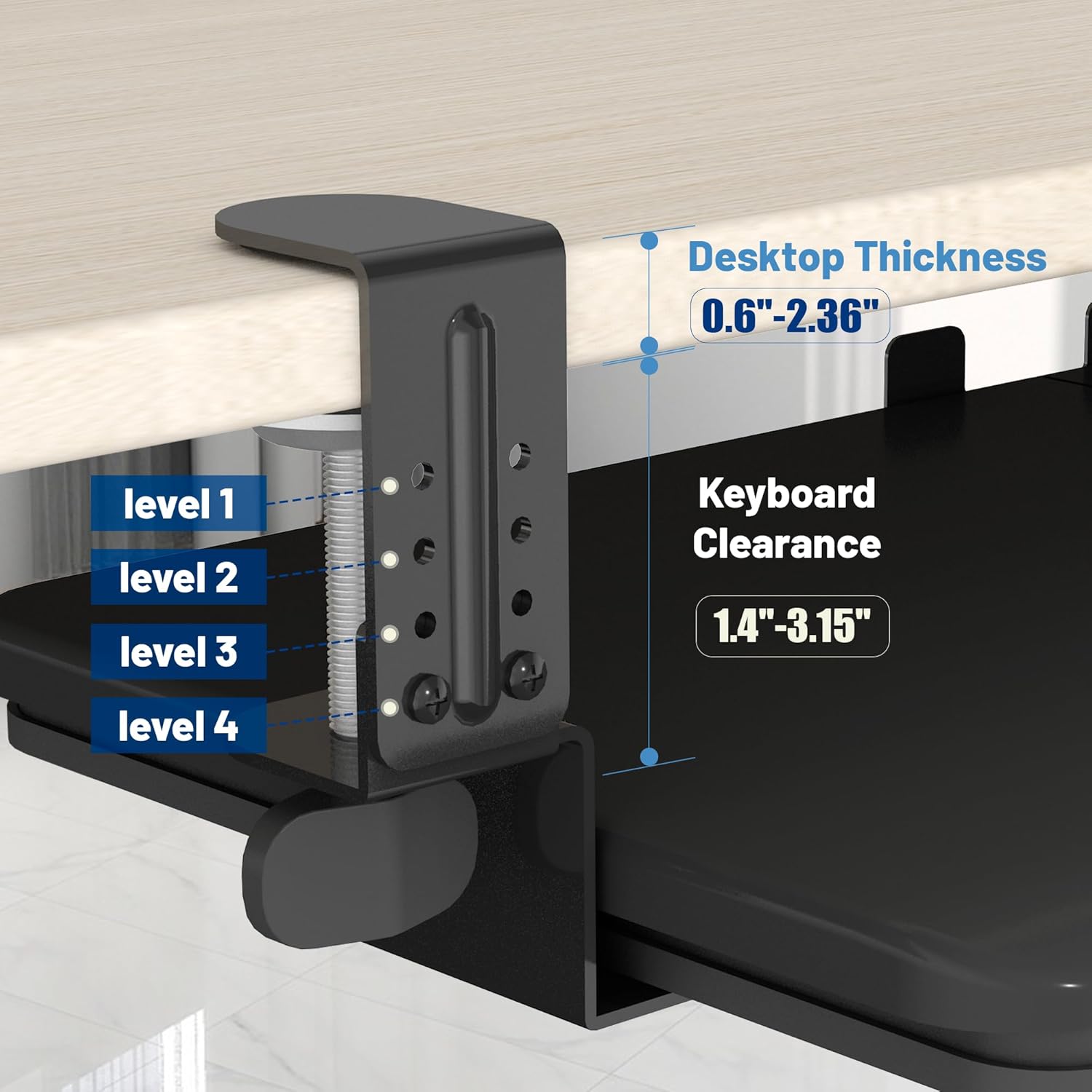 Fits full-size keyboards + mouse, freeing up desk space. C-clamps attach without drilling; clear instructions streamline the process. Experience a tailored typing setup with our unique 4-point adjustable system, offering up to 1.6” of height adjustment. Beveled edge for wrist comfort and a rear stopper to prevent slippage. Before purchasing, make sure your desk is compatible! This under desk keyboard tray helps reduce strain on your wrists and shoulders while maintaining the ideal monitor distance to protect your eyes.