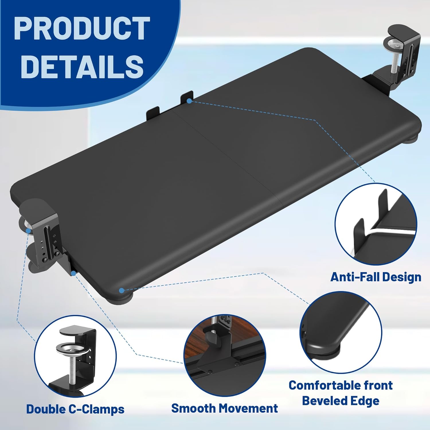 【Built to Last – Sturdy and Secure】Engineered with heavy-duty C-clamps and anti-slip padding to keep your keyboard stable with every keystroke while protecting your desk from damage, this under desk keyboard tray slide-out system stays firmly in place. The built-in backstop prevents accidental keyboard slips, ensuring a secure and efficient workspace