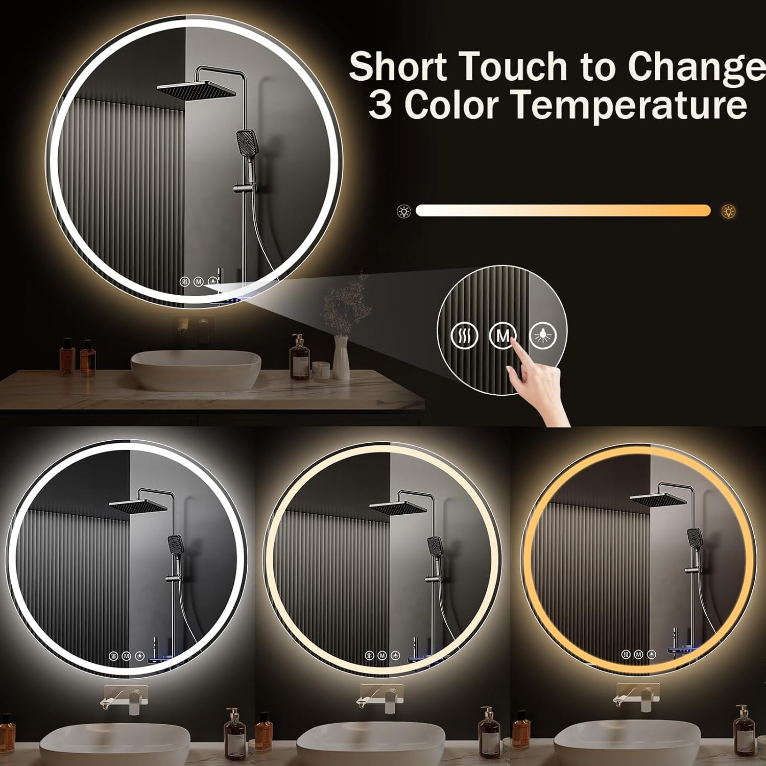 Anti-fog technology, 3-color temperature,lighting (warm/natural/cool), Dimmable brightness,Tempered glass construction
