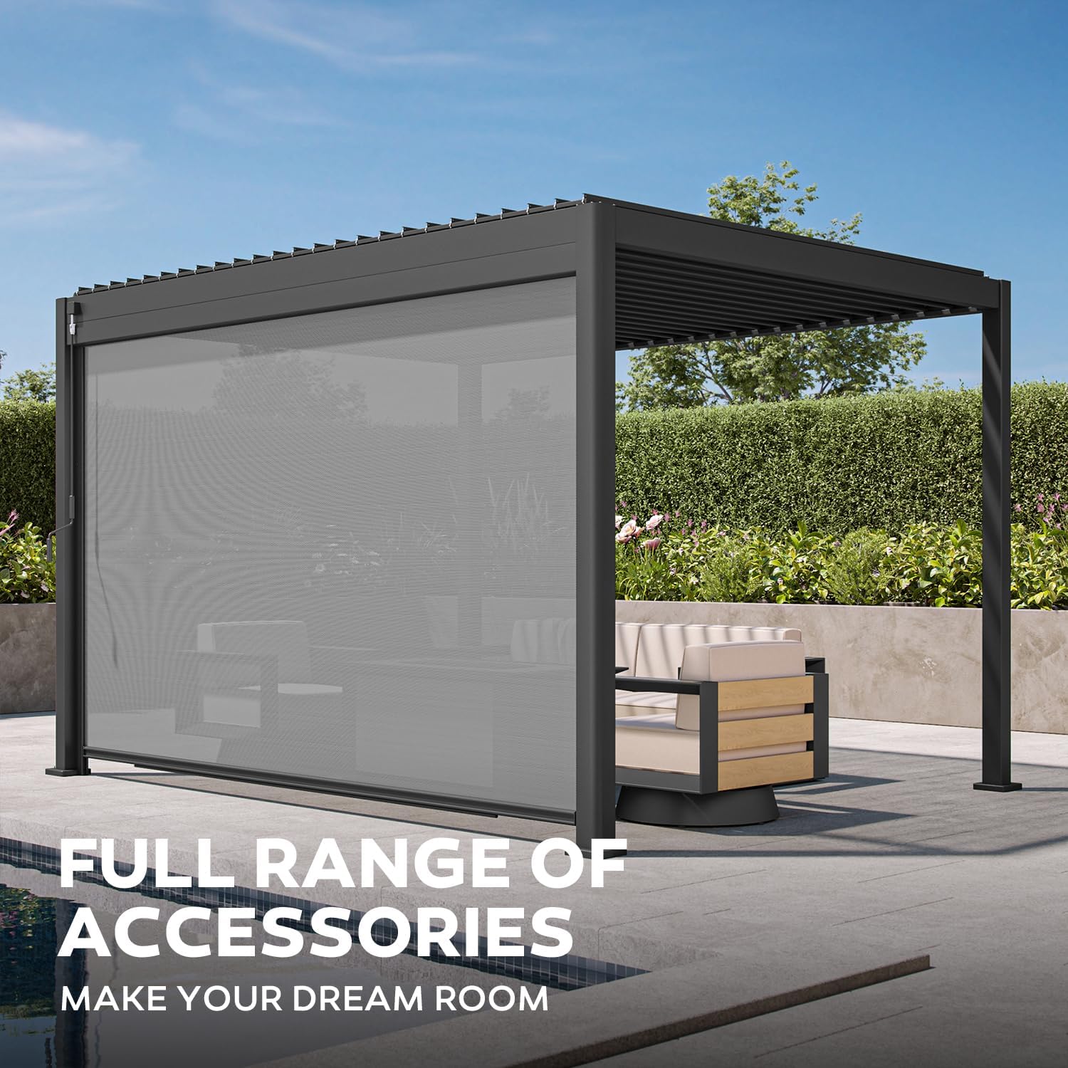 Weather Precautions: To prevent potential damage to your pergola, avoid snow accumulation on the louver roof. In high winds or extreme weather conditions, open the louvers and elevate or remove any shade screen accessories.