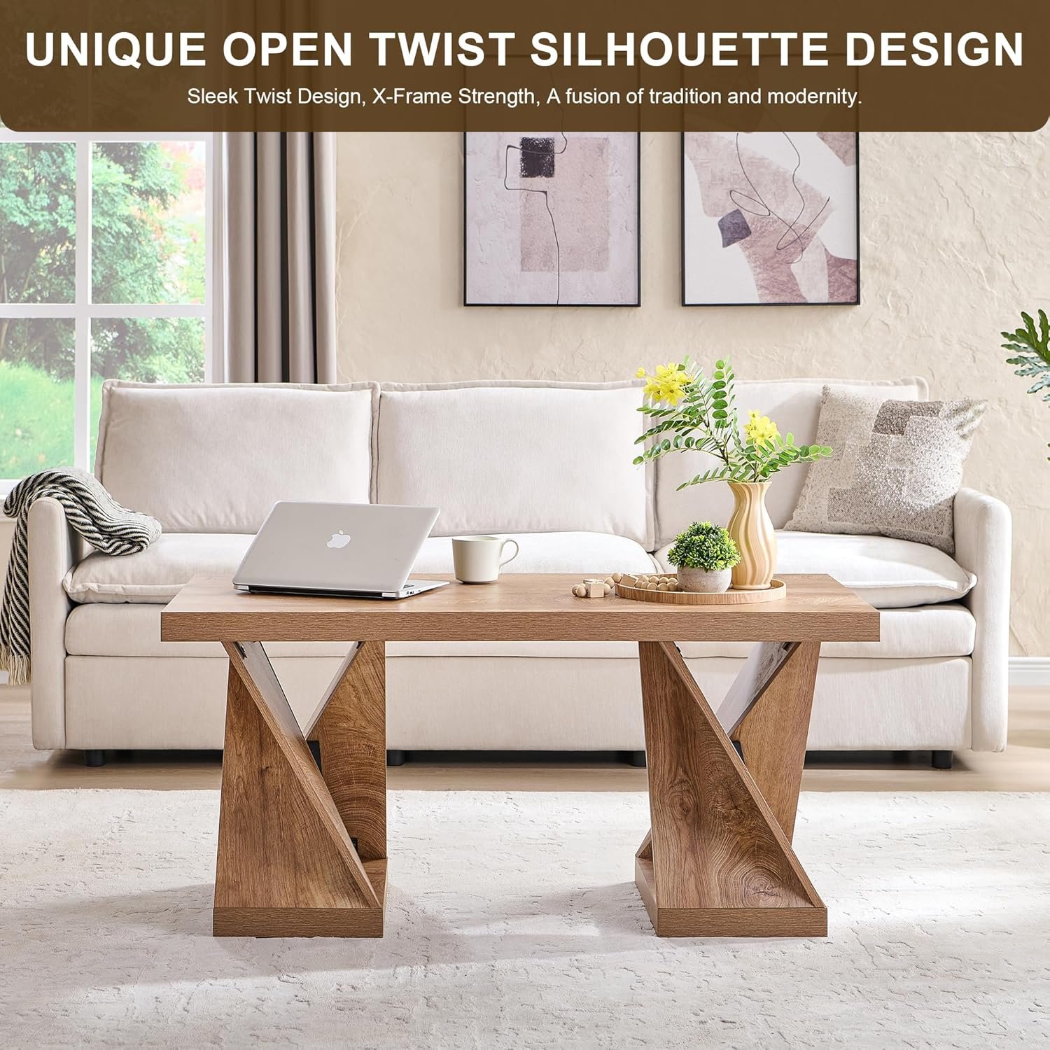 Versatile, Stylish Table: Measuring 48″L × 22″D × 24″H.This coffee table combines style and practicality.,22″ wider tabletop, provides you with a tabletop area for eating, watching a movie, or working from home on your laptop. This unique twisted modern coffee table it not only keeps your living room tidy, but also complements the surrounding furniture and décor themes ranging from modern to rustic styles, giving a warm and inviting feeling to gather your family around and enjoy the warm and intimate atmosphere.