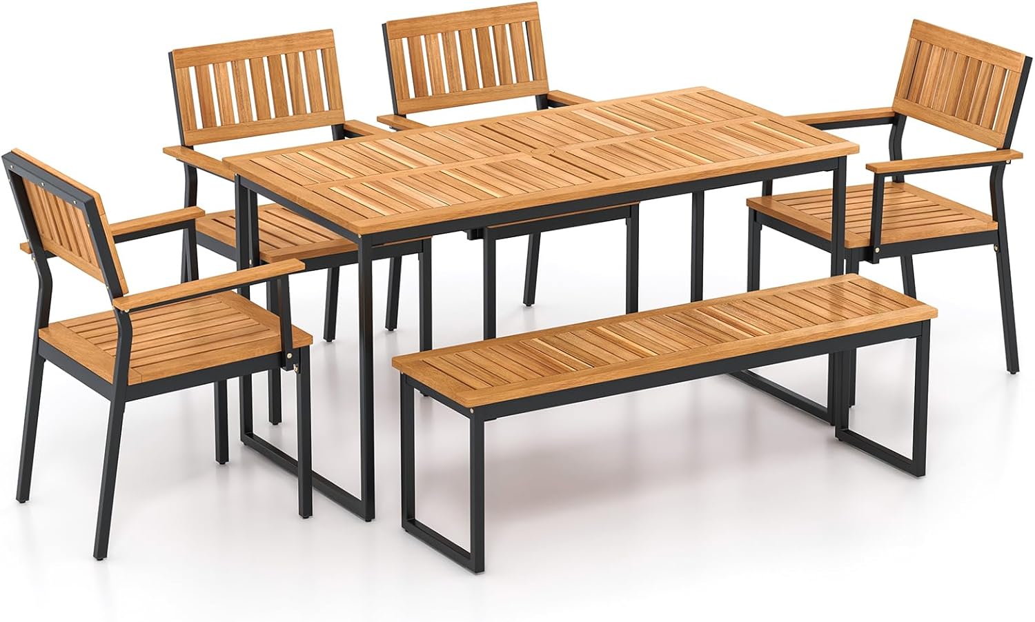 5 reviews for Tangkula 6 Pieces Outdoor Acacia Wood Dining Set, Patio Table and Chairs Set with Bench for 6-7 People, Outdoor Dining Furniture Set with 2″ Umbrella Hole for Garden, Backyard and Poolside