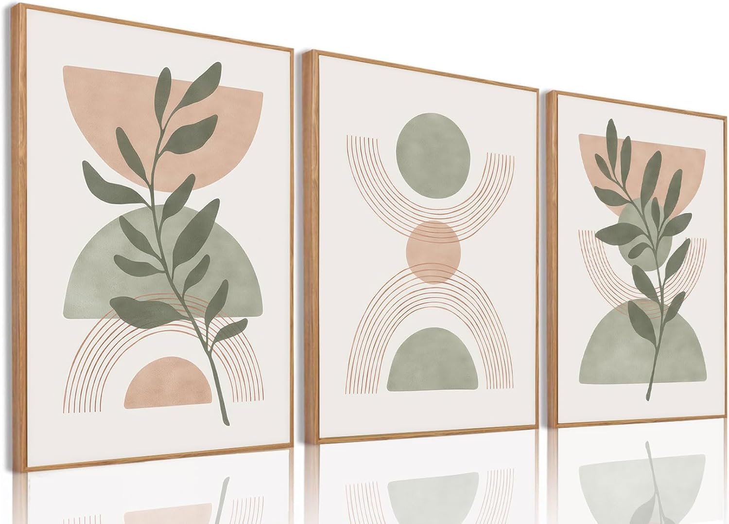 Bwodke Boho Wall Art, Framed Abstract Wall Art, Green Botanical Neutral Canvas Wall Decor, Large Mid Century Plant Pictures Set of 3, Modern Minimalist Paintings, for Bedroom Living Room Bathroom